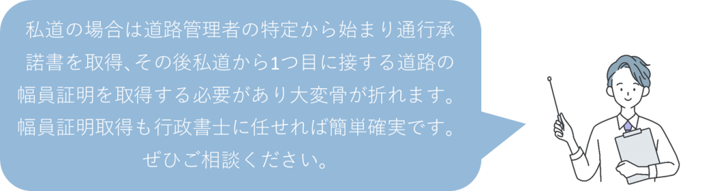結論からいうとその道路を管理している事務局から「幅員証明」を取得することです。